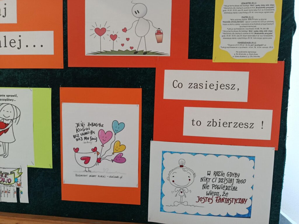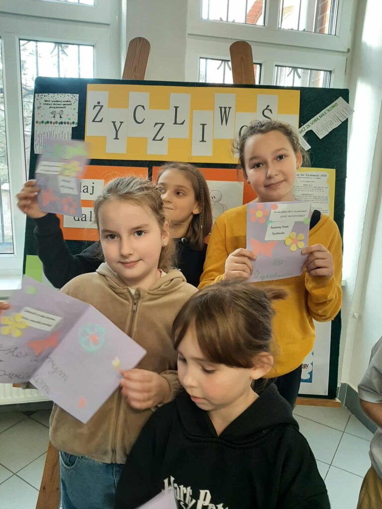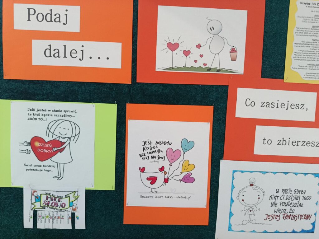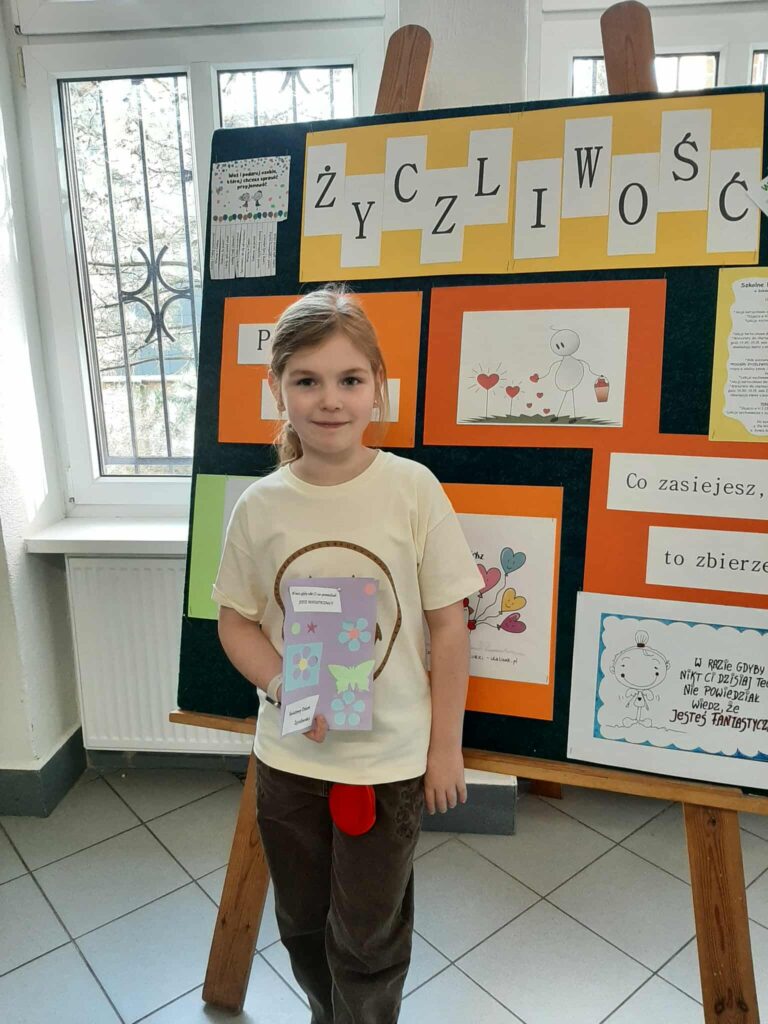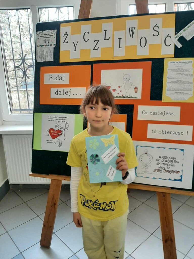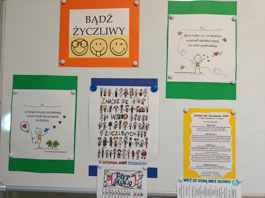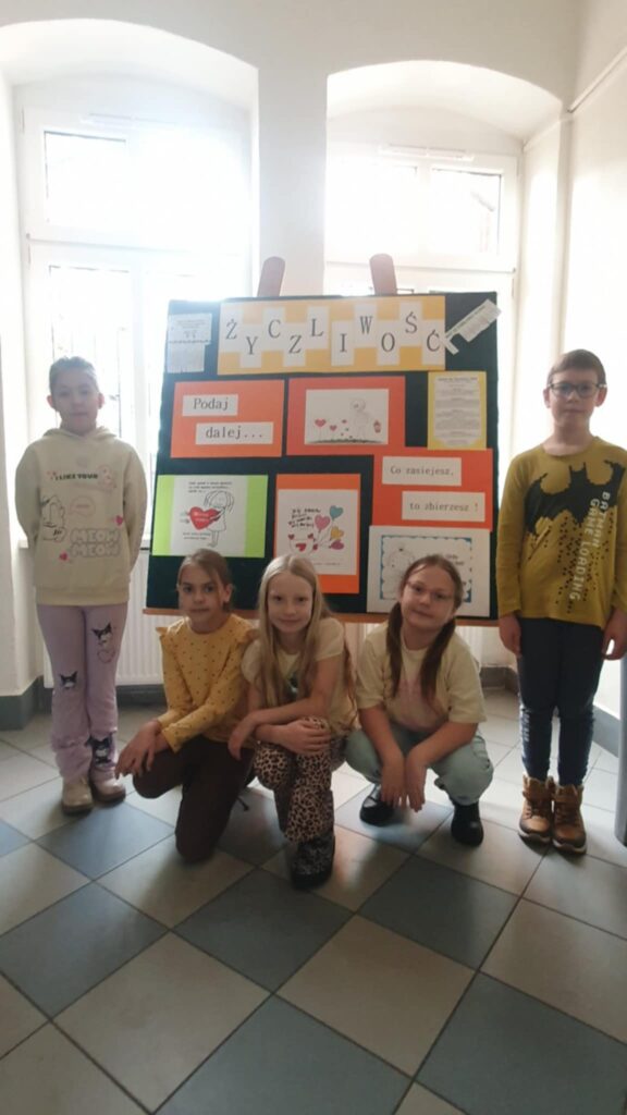 Podczas obchodów tygodnia życzliwości, uczniowie naszej szkoły mieli wiele okazji aby obdarować innych swoją dobrą energię. Odbyło się wiele ciekawych inicjatyw. Dzieci rozdawały karki z miłymi sentencjami pracownikom i nauczycielom szkoły, odbyły się warsztaty z psychologiem szkolnym w klasach I-III oraz w kl. 1a także z pedagogiem szkolnym, na temat życzliwości. Dzieci dzieliły się dobrymi słowami także z okolicznymi mieszkańcami w trakcie marszu po okolicy. Dzieci wykonywały trójwymiarowe, „ruchome” karteczki z postaciami z bajek przygotowanymi przez szkolnych specjalistów. Całość uświetniona została ubiorem i gadżetami w kolorze żółtym w Światowym Dniu Życzliwości w piątek, jak tez licznymi gazetkami szkolnymi. Zaledwie 3 akty życzliwości tygodniowo poprawiają akceptację rówieśniczą i dobrostan, czego dowiedli badacze z Kanady. Według badań „Kindness counts” z 2012 roku zachęcanie dzieci do zachowań prospołecznych zwiększa poziom akceptacji u rówieśników oraz wpływa na dobre samopoczucie. Korzystajmy z tej wiedzy i przekazujmy życzliwość innym każdego dnia.