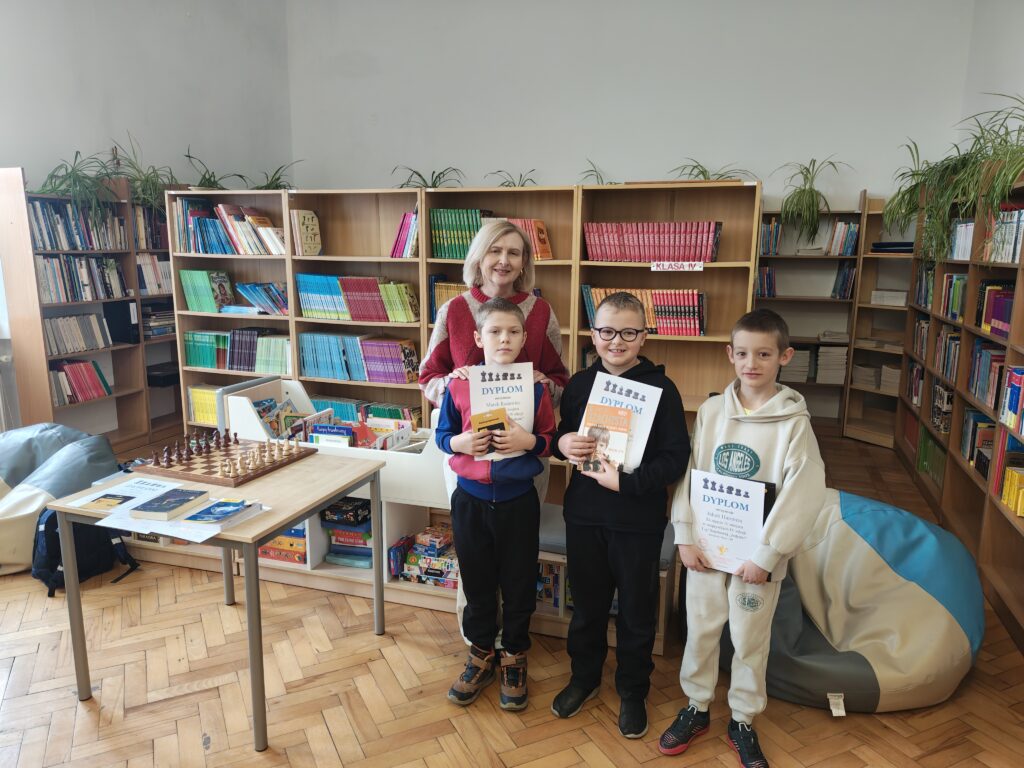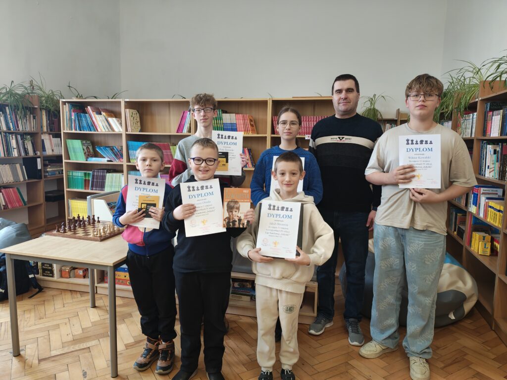 Dodatkowo pamiątkowe dyplomy otrzymali uczniowie, którzy znaleźli się tuż poza reprezentacją szkolną, ale bardzo angażowali się w rozgrywkach do samego końca: Andrii Kramarov (4b), Natasza i Tatiana Ziemienowicz (5a), Daria Stepukh (6a) i Filip Żmuda (7b). Podziękowania natomiast należą się wszystkim uczestnikom tegorocznej edycji ligi szachowej „Jedynki” – za wspaniałą walkę w duchu fair play i integracji, samodzielność podczas wyszukiwania swoich przeciwników na przerwach, uczynienie z biblioteki profesjonalnej areny rozgrywek „królewskiej” gry.
