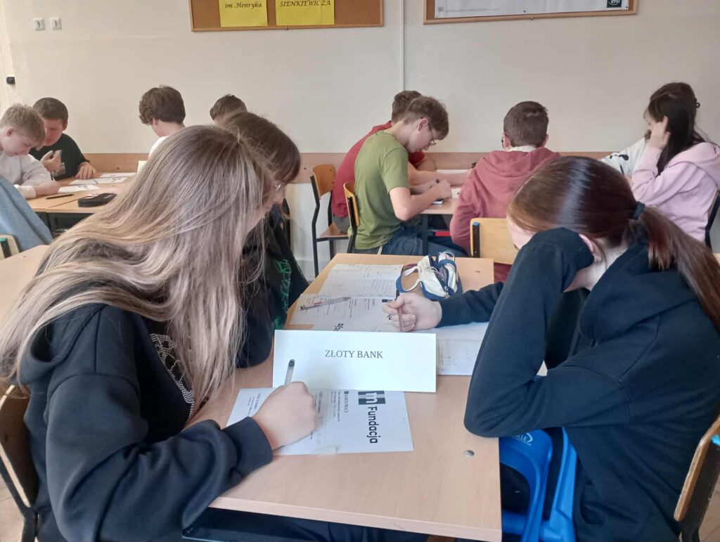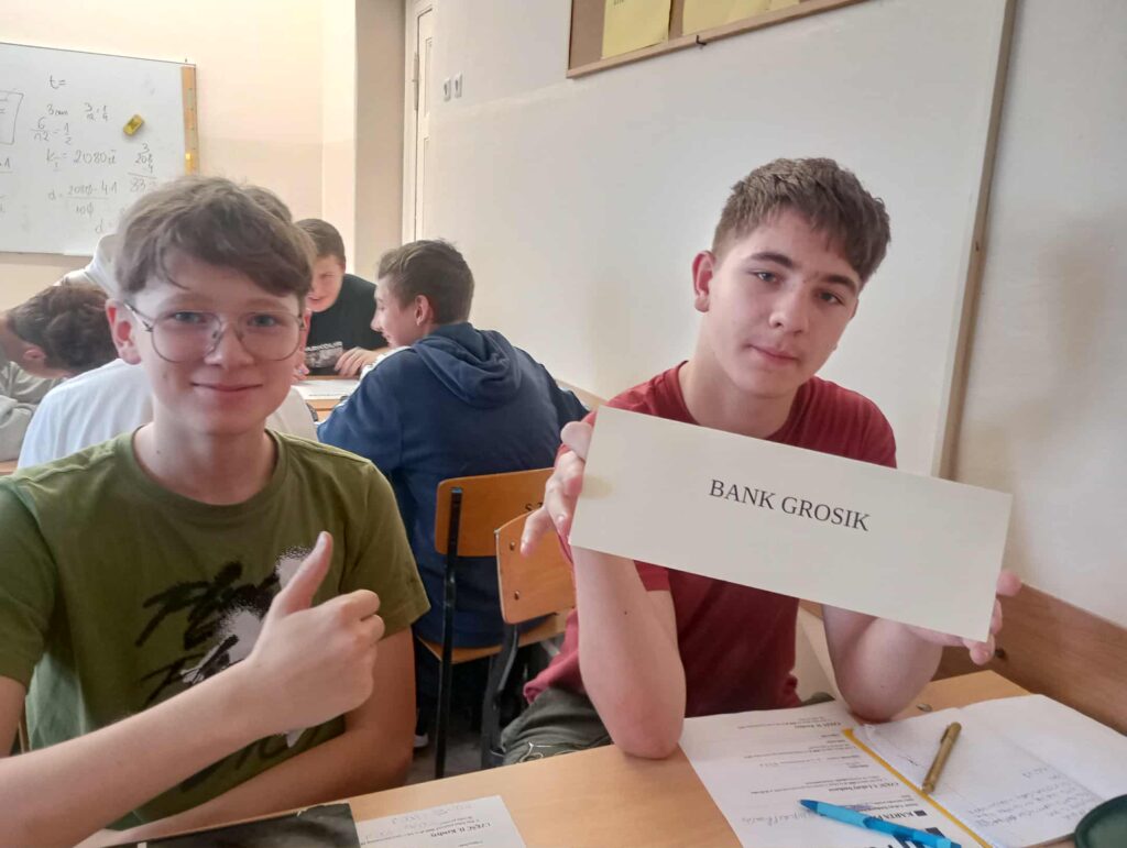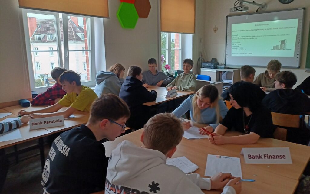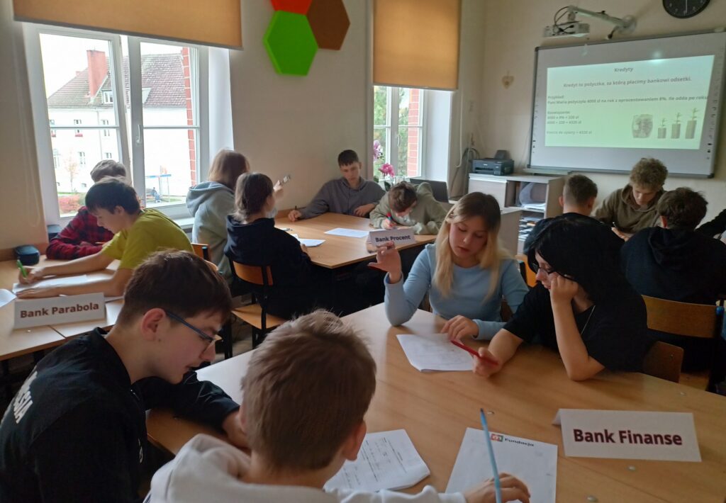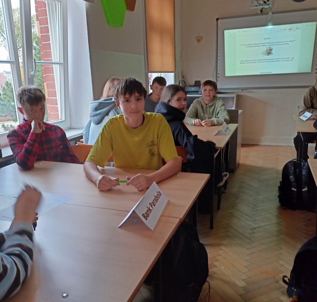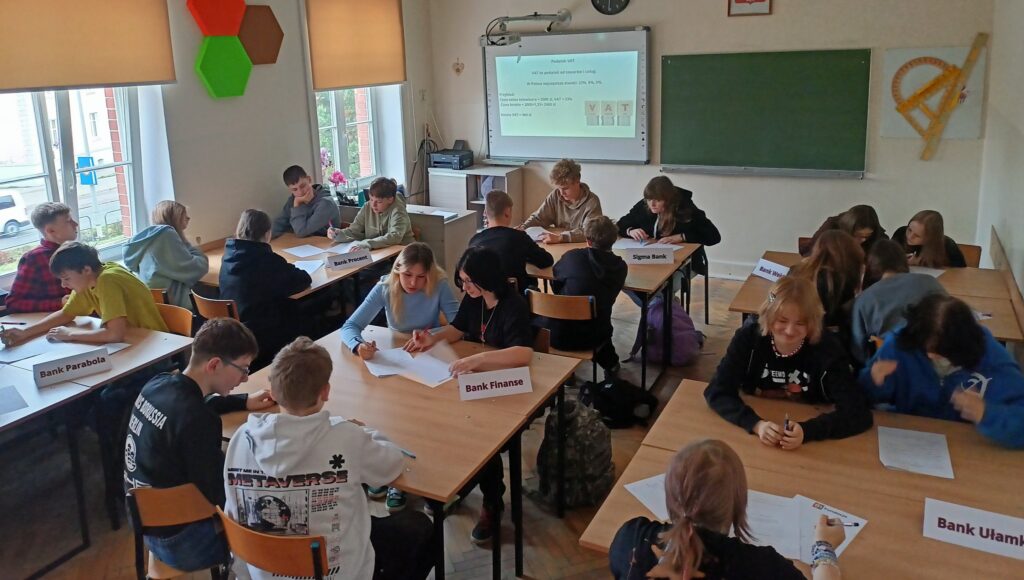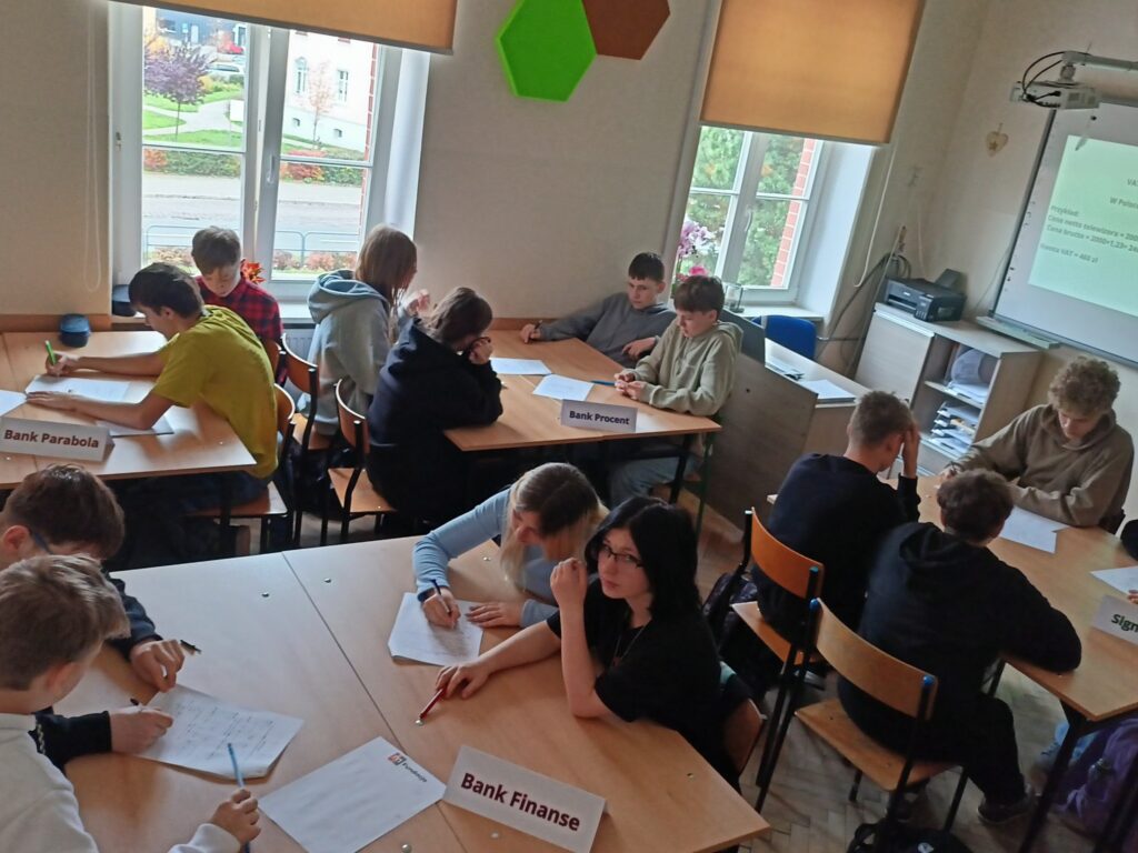 Podczas warsztatów uczniowie poznali zasady działania lokat i kredytów, dowiedzieli się, czym jest podatek VAT oraz jak wpływa na ceny produktów i usług. Wykonali również praktyczne zadania z obliczeń procentowych, które pozwoliły im lepiej zrozumieć zastosowanie matematyki w codziennym życiu. Pracując zespołowo, tworzyli własne wirtualne banki, a następnie podejmowali decyzje finansowe, mierząc się z realistycznymi wyzwaniami – niczym prawdziwi ekonomiści! 💡💳