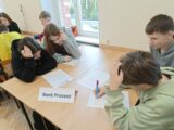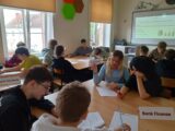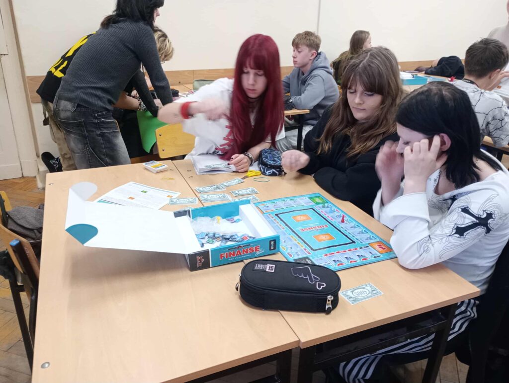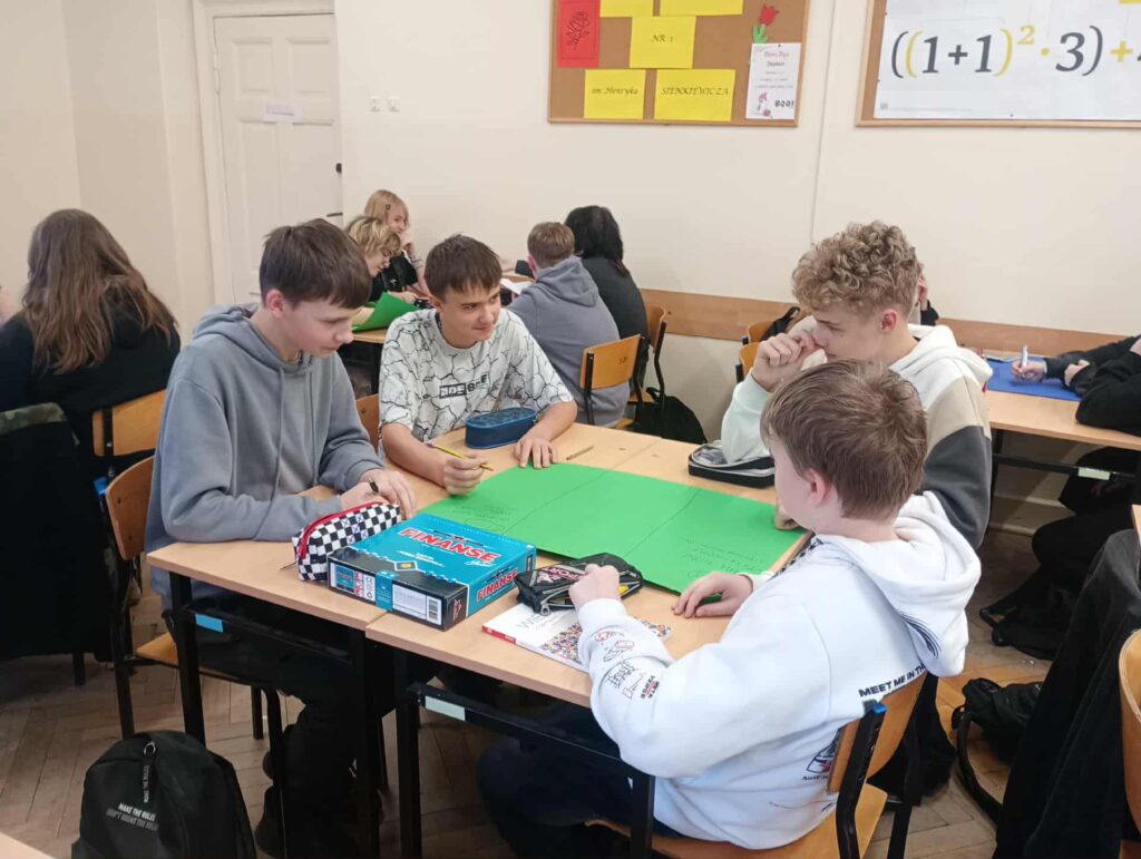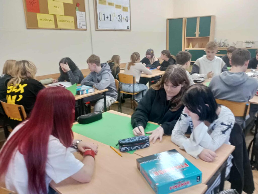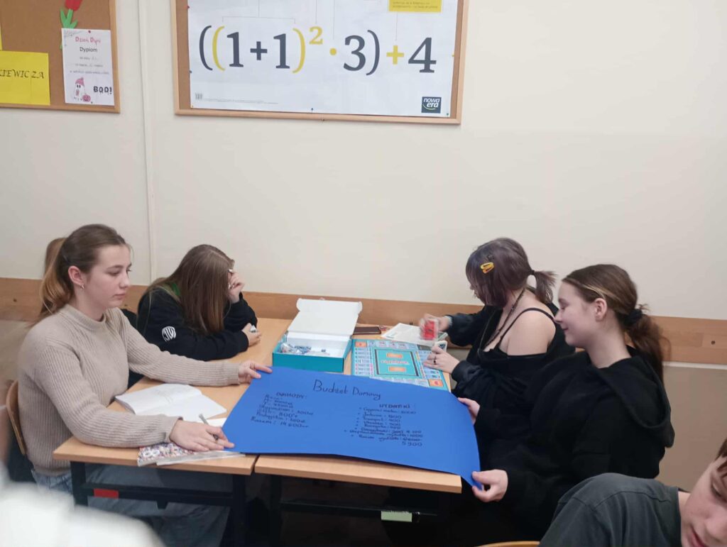 W dniu 17.11.2025 r. uczniowie kl. 8b uczestniczyli w kolejnych zajęciach poświęconych finansom domowym w ramach projektu ,,Smart Math-mądre decyzję w świecie finansów” – dofinansowanych z fundacji mBank. Uczniowie pracowali w zespołach zadaniowych, analizując przykładowe przychody i wydatki gospodarstw domowych. Każda grupa opracowała własny projekt budżetu domowego, który następnie został zaprezentowany na forum klasy. Uczniowie wykazali się zaangażowaniem, kreatywnością oraz umiejętnością praktycznego zastosowania zdobytej wiedzy. Zwieńczeniem warsztatów było wykorzystanie edukacyjnej gry ,,Finanse”, pozyskanej z fundacji mBanku. Gra umożliwiła uczniom utrwalenie zdobytych umiejętności w formie interaktywnej i sprzyjała rozwijaniu kompetencji finansowych poprzez zabawę. Zajęcia pozwoliły uczniom lepiej zrozumieć zasady planowania budżetu, odpowiedzialnego gospodarowania środkami oraz przewidywania konsekwencji decyzji finansowych.